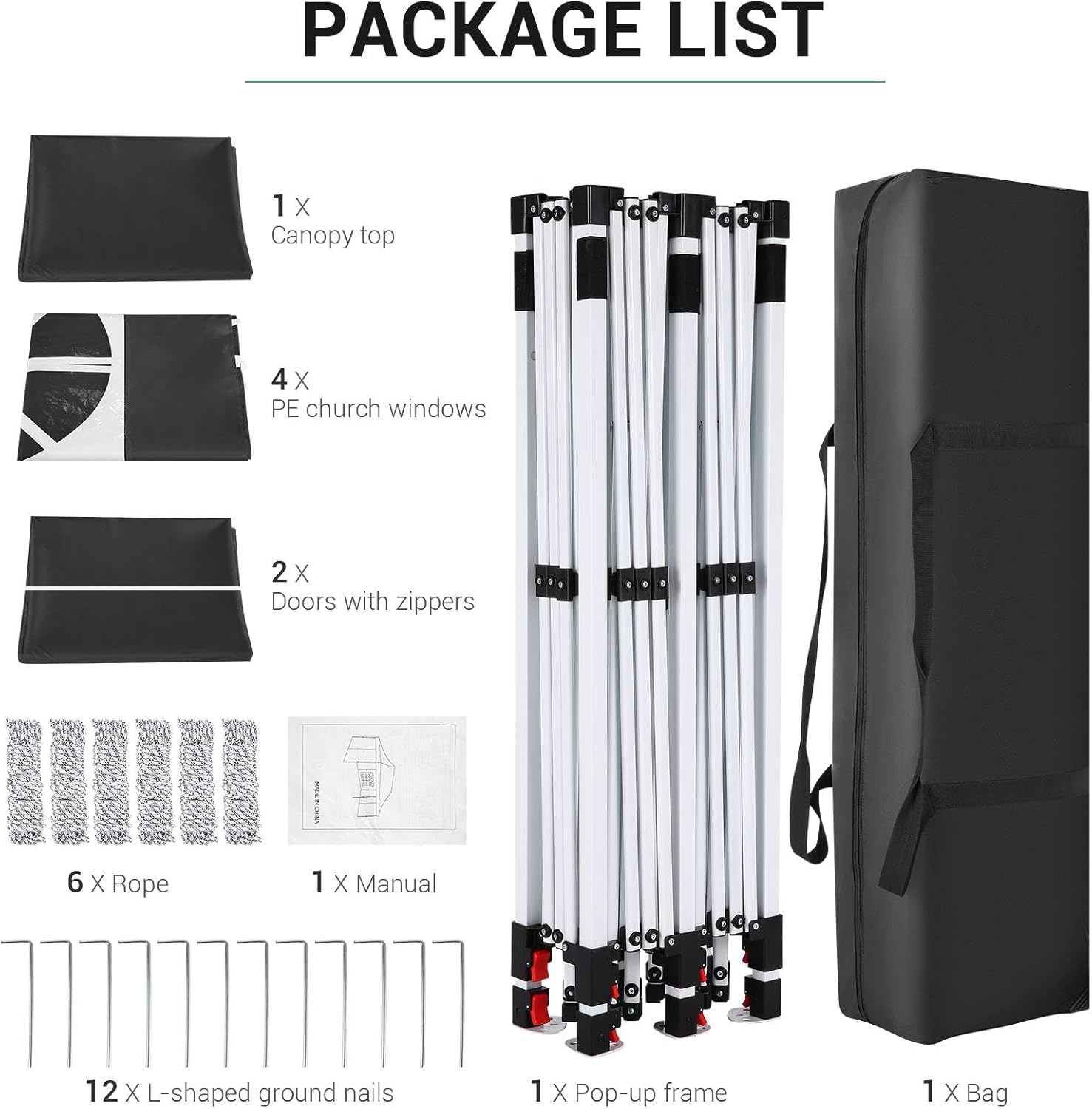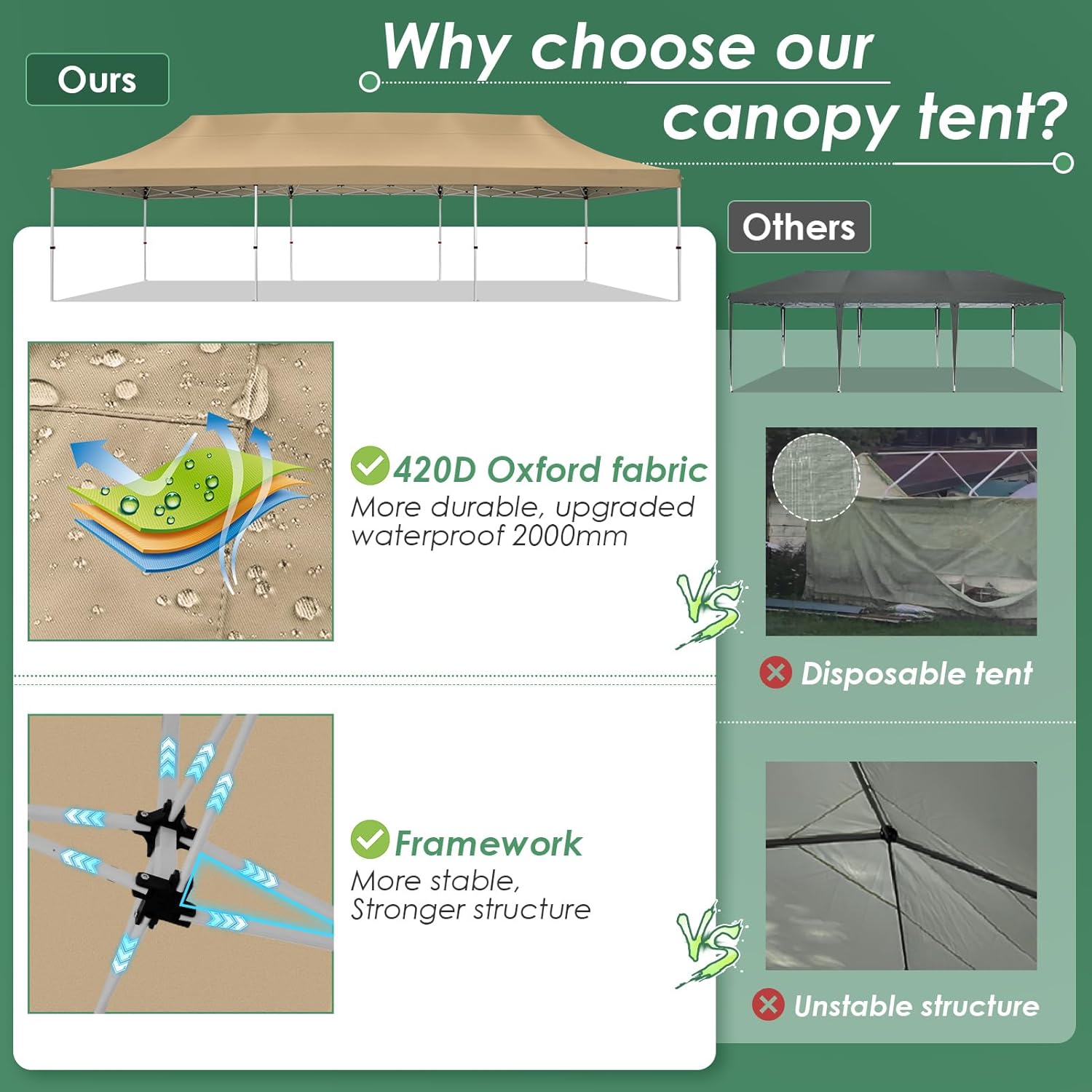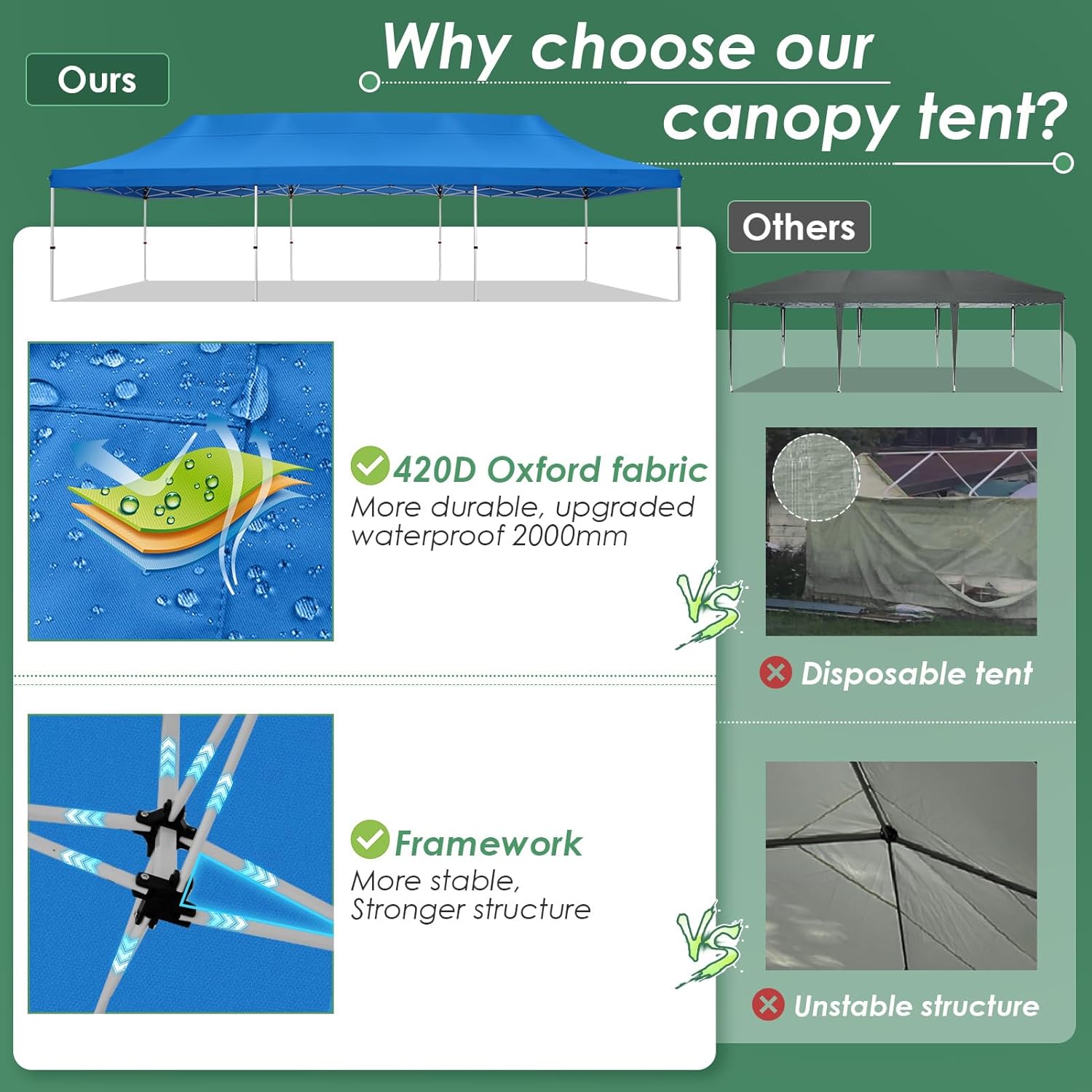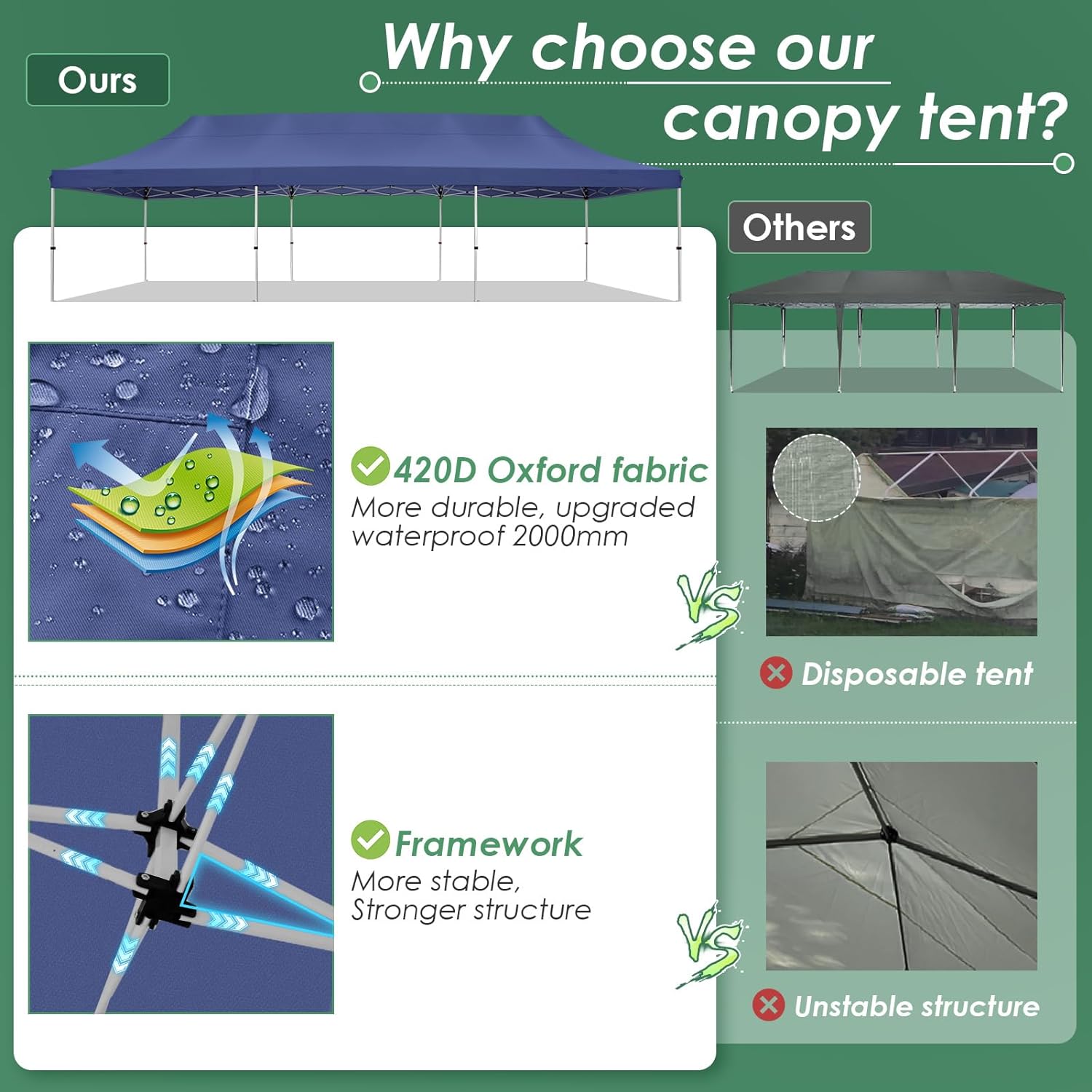 - The TOOLUCK 10x30 pop up canopy has an improved, thickened metal frame, the metal legs reach a thickness of 25x25 mm and are provided with an anti-rust coating.