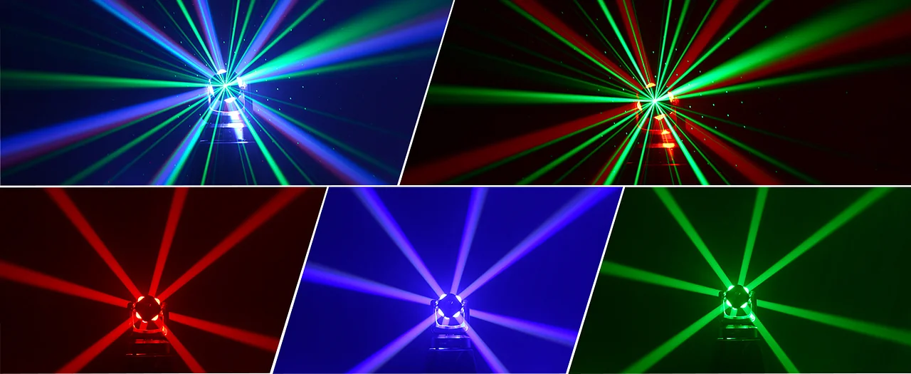 Light source: 8pcs 10W (RGBW) LED + 2pcs 100MW red laser + 2pcs 100MW green laser, 4pcs 8W strobe beads