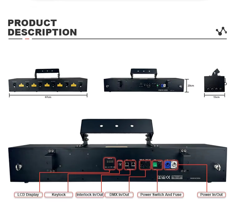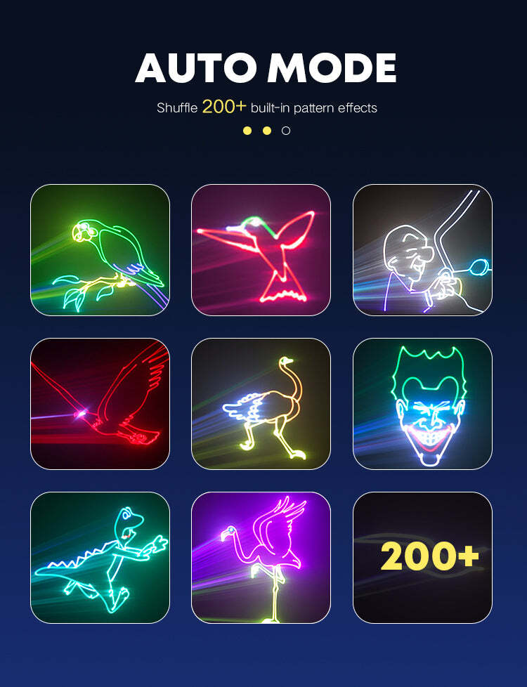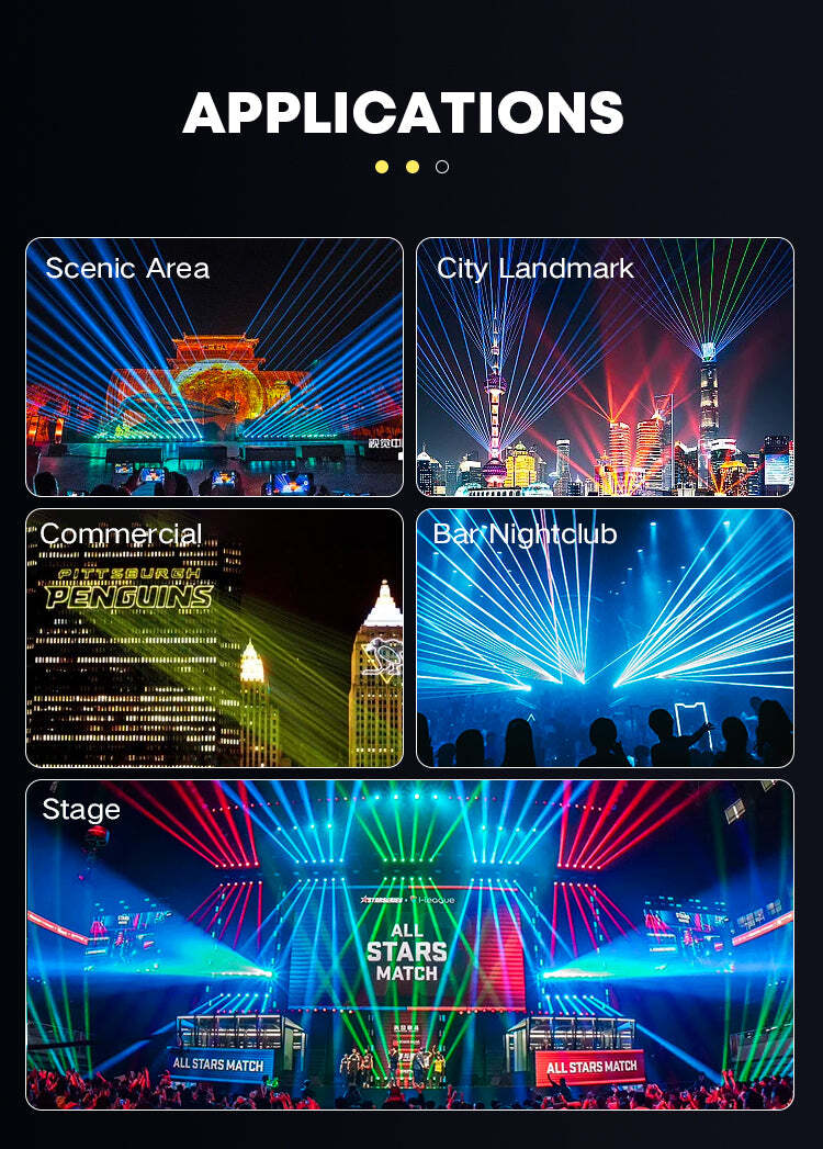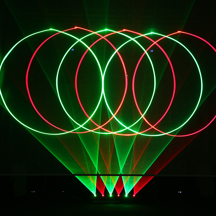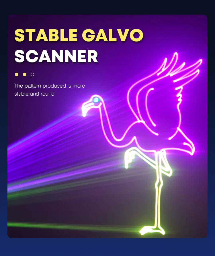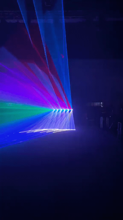 Laser power/wavelength: 6 2.5W RGB semiconductor synthesized lasers