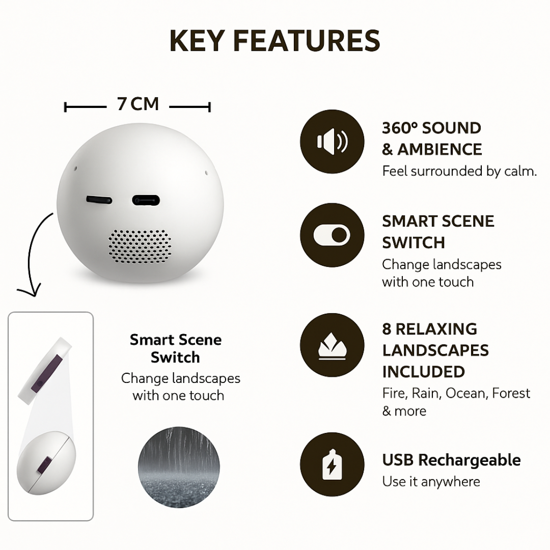 DreamSphere" transforms restless nights into moments of pure calm.Feel your mind unwind, your body release tension, and finallyexperience the deep, peaceful sleep you've been missing.
