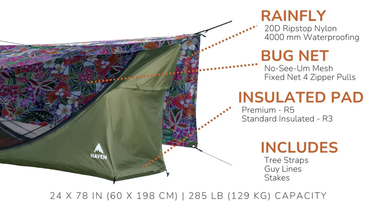 - Includes insulated pad, weatherproof rainfly, bug net, tree-friendly suspension, and storage pockets.