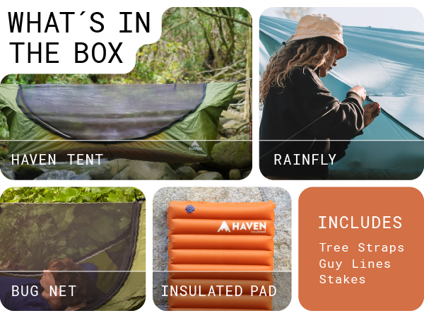 - The full kit includes a roomy hammock, insulated sleeping pad, weatherproof rainfly, secure bug net, durable tree straps, stakes, guy lines, and storage pockets.